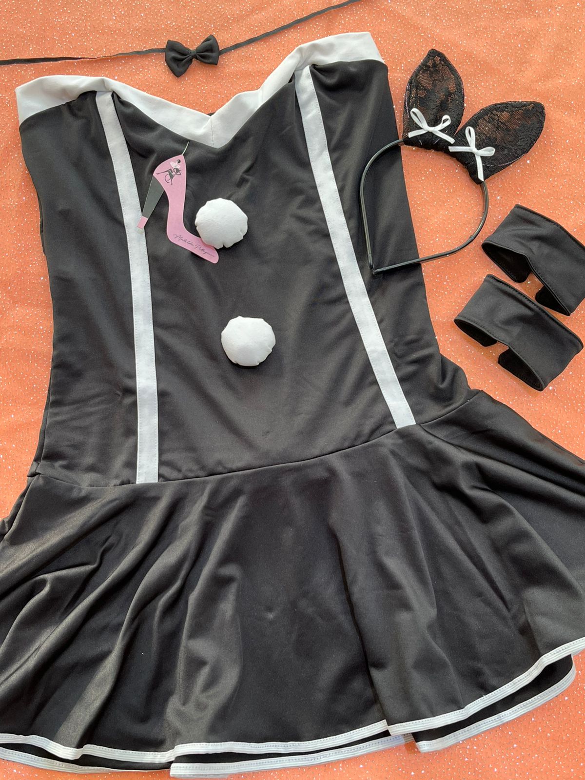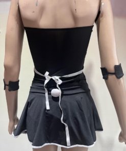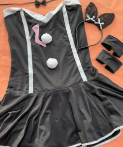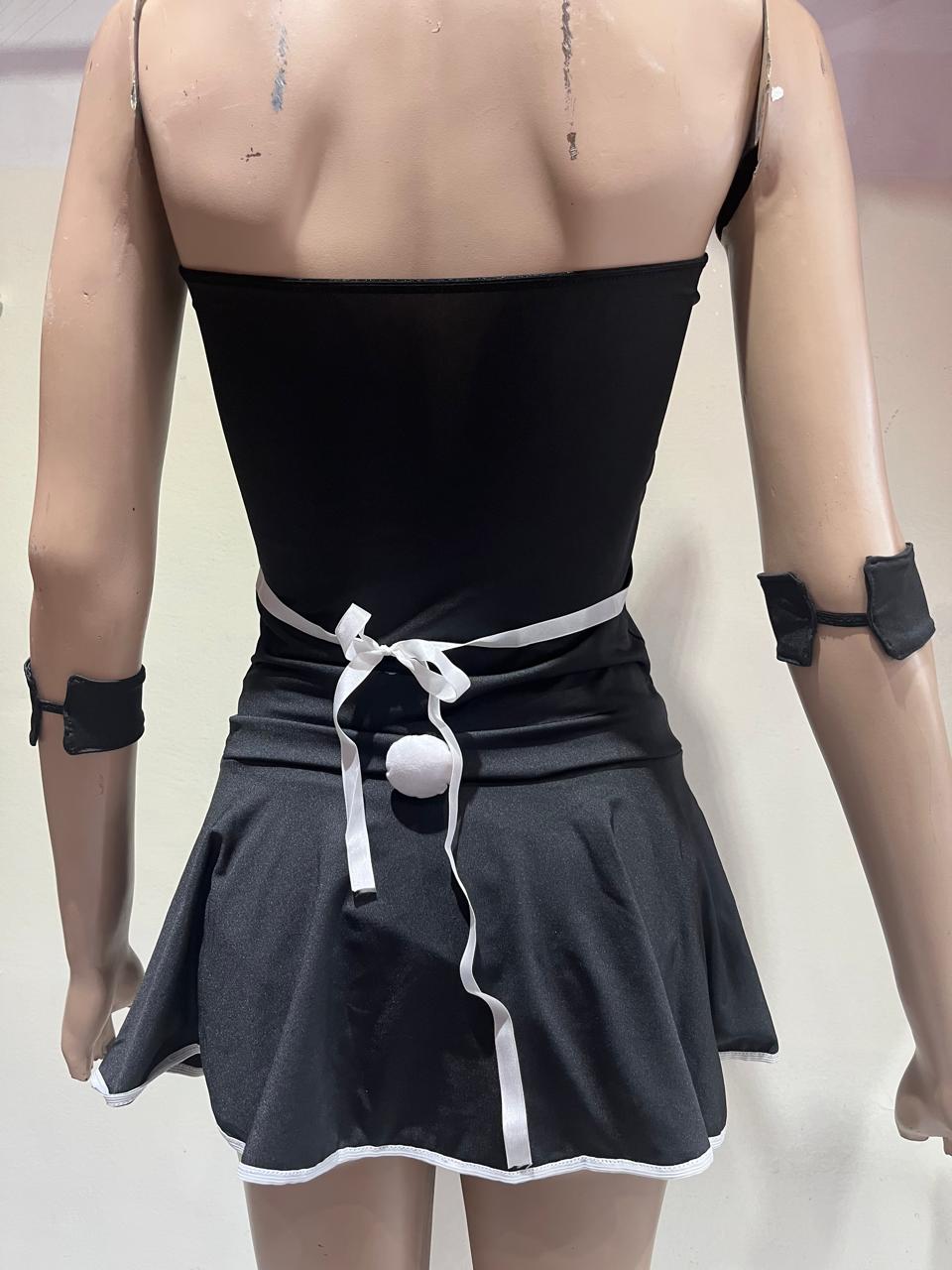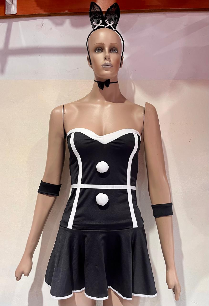 Contiene vestidos strapless lycra, vincha con orejitas de encaje y muñequeras de lycra.