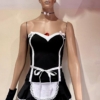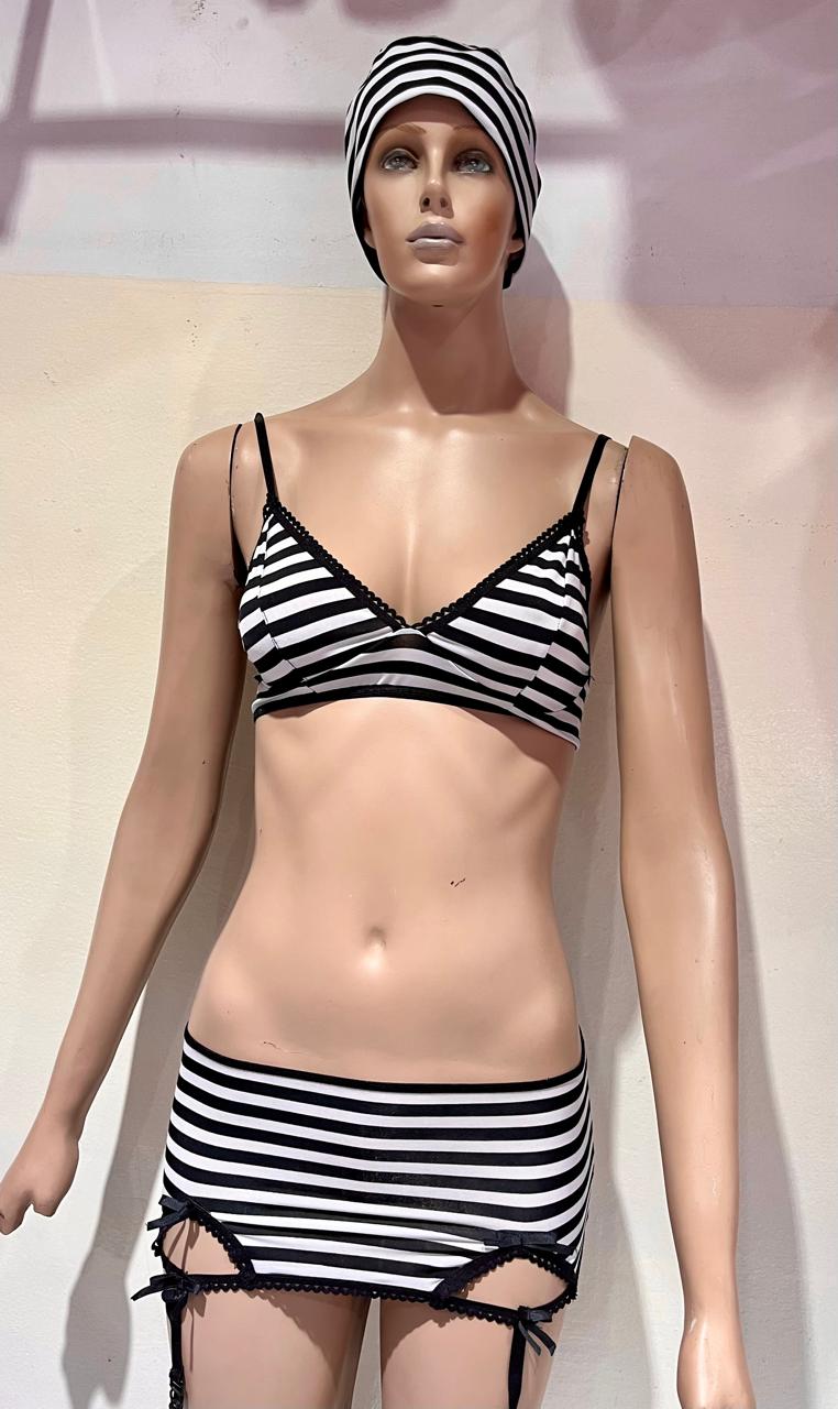 Contiene corpiño bralette con detalle de puntilla. Pollera corta con portaligas incorporado. Gorrito. Todo rayado blanco y negro.