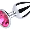– Delicado Plug anal metálico escalonado, suave y sobrio, de acero con hermoso rubí de variados colores y Base de Strass.